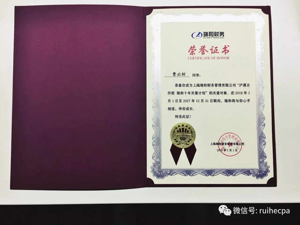2018年1月5日,在上海商业会计学校名为“共建 融合 未来”德育主题论坛上,“沪滇合作班瑞和十年关爱计划”正式启动。瑞和企划部总监张海燕代表瑞和向上海市教委、经信委、学校领导介绍了“沪滇合作班瑞和十年关爱计划”的主要内容:在2018年1月1日至2027年12月31日的未来十年期间,瑞和将设立奖学金,鼓励品学兼优的同学;设立帮困基金,资助经济困难的学生;利用自有资源为学生未来的职业发展提供辅导及帮助;对学生未来在学习及工作中涉及会计专业方面的困难提供咨询及辅导。通过经济资助、实地探访、送教上门等形式,与学生们心手相连,陪伴成长。瑞和还向每位学生颁发了“瑞和十年关爱计划”证书。